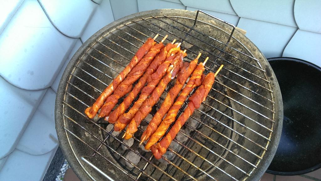 Datteln im Speckmantel Bauernpizza mit Peperoni und Hähnchenspieße an Grillkartoffeln. Die Vorspeise Teil 2.